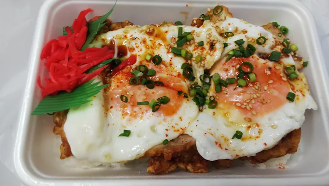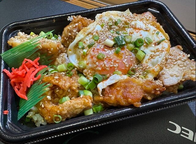 唐揚げには、天丼のタレを思わせる甘辛いタレがトロッと掛けられ、さらに半熟の目玉焼きが乗っています。