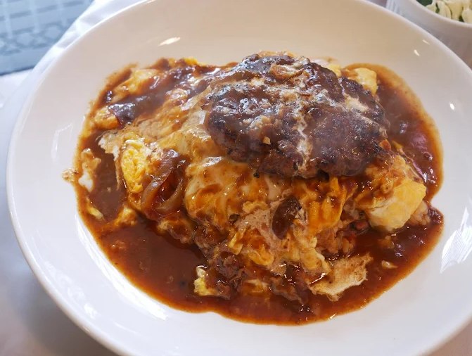 トロトロまろやかな卵と程よいコクのハヤシソースが、中のしっとりケチャップライスと完璧に調和しています。