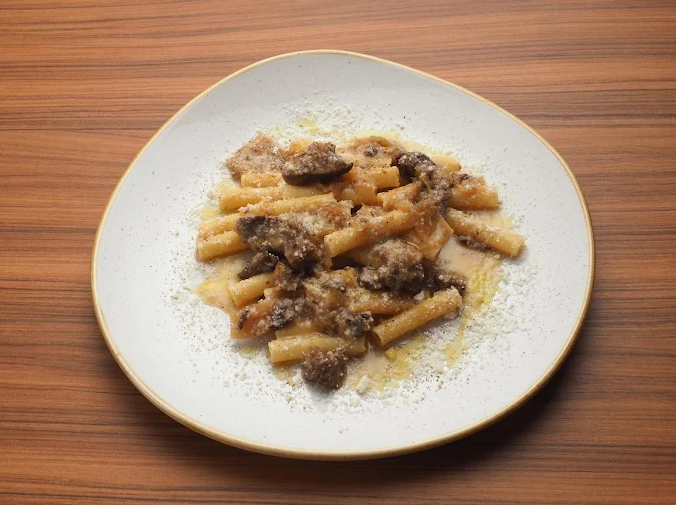 中太ショートパスタに、玉ねぎと肉をじっくり煮込んだナポリ伝統のソースとチーズが絡み合う逸品です。