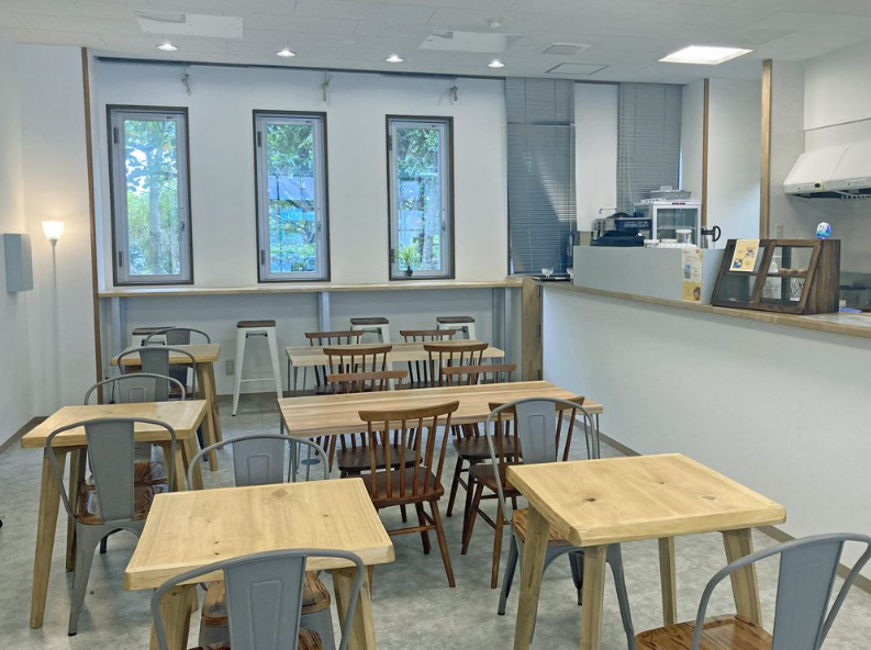 物販コーナーの奥に進むと、落ち着いた雰囲気のカフェスペースが広がり、ゆったりと休息を楽しめます。