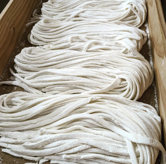 国産小麦を独自にブレンドした粉を使い、手包丁で一本ずつ丁寧に仕上げる純手打ちです。