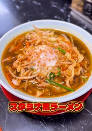 スタミナ黒ラーメンは生ニンニクを香ばしく炒め、特製タレでピリ辛に仕上げたパンチの効いた一杯。