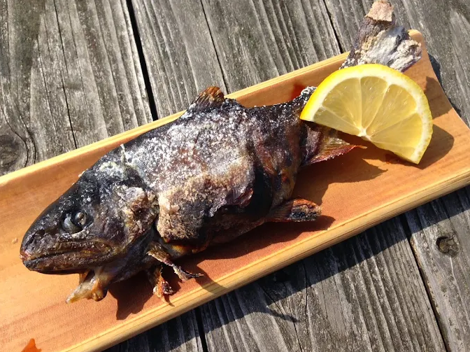 やまめは、素朴な味を一層引き立てる炭火でじっくりと香ばしく焼き上げられます。
