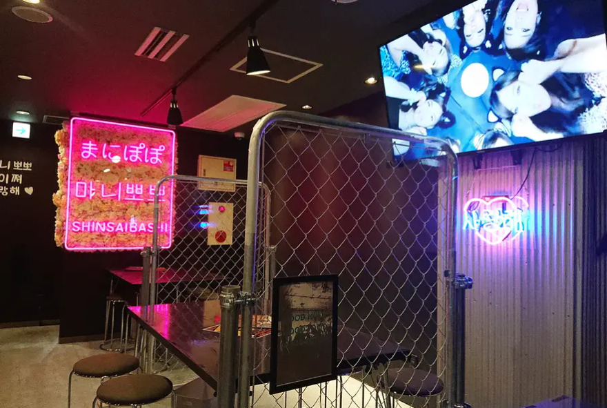 ネオンが輝くポップな店内には大型プロジェクターが完備され、常にK-POPのライブ映像が流れています。