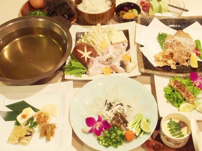 一年中美味しく味わえる日向灘産の虎ふぐを使用しており、ちり鍋や七輪焼きなど多彩なコースが揃いました。