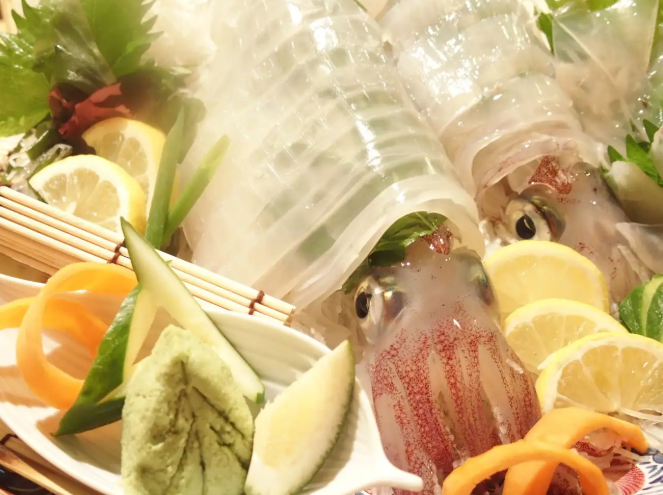 いけすから揚げたばかりのイカは、コリコリとした食感と噛むほどに広がる濃厚な甘みが口いっぱいに響きます。