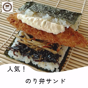 「のり弁サンド」は、懐かしいのり弁の味をそのままサンドイッチにしました。サクサクに揚げた白身フライと、きんぴらごぼう、そして昆布の佃煮。のり弁の定番おかずをすべて挟み込みました。お米は冷めても美味しい酢飯を使用し、のり弁の魅力を最大限に引き出しています。定番でありながらも、新しい感覚で楽しめる、他にはない唯一無二のサンドイッチです。