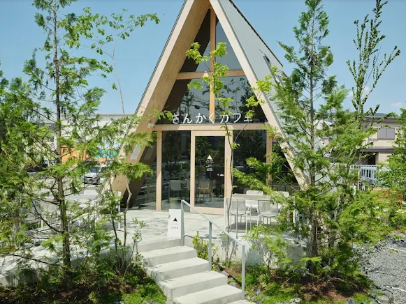 おしゃれな三角形の建物の「さんかくカフェ」は、誰もが快適に過ごせるよう細やかな配慮がされています。
